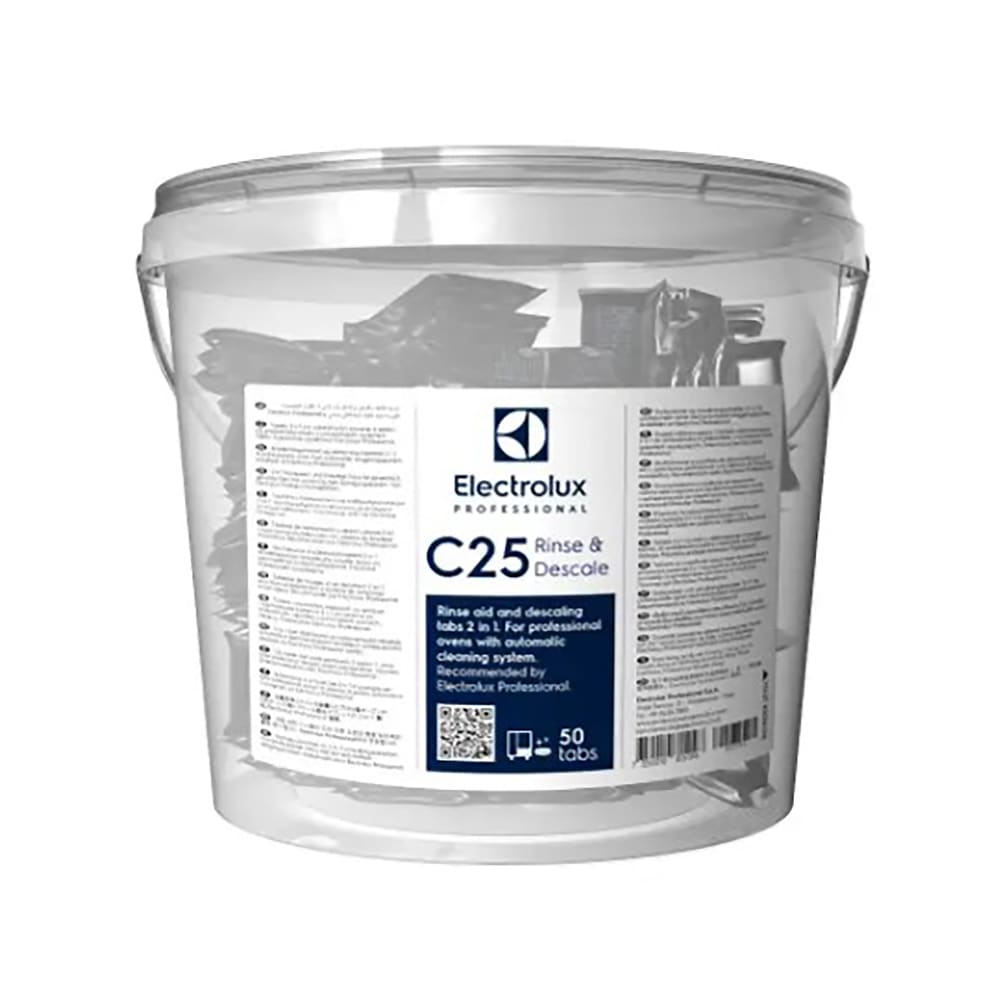 These Electrolux Professional Rinse Aid & Descaling Tablets come in a bucket of 50. These tabs are designed to rinse out the interior oven cavity and remove limestone in Electrolux Professional Skyline ovens and cooking equipment. Each tab is approximately 1.4 inches (35 mm) in diameter, wrapped in foil, and has a pH level of 2-3. They work in conjunction with the 0S2395 C22 Cleaning Tabs and the 0S2392 C23 Cleaning Powder.