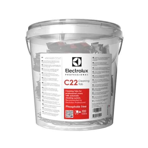 These Electrolux Professional C22-CLEANING TAB comes in a 100-tab bucket and is designed for use with Electrolux Professional Skyline ovens and cooking equipment. These tabs are highly effective in rinsing out the interior oven cavity and removing limestone. Each tab has a diameter of approximately 1.4 inches (35 mm) and is wrapped in foil.