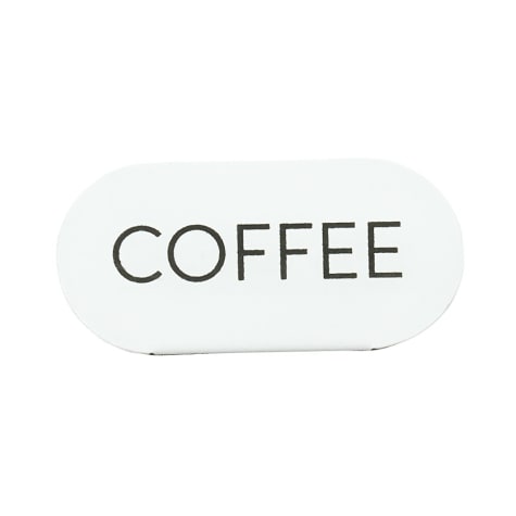 The Cal-Mil 23401-1-15 is a white metal table tent sign that clearly labels "Coffee." Its compact, curved design is perfect for coffee stations at buffets, hotels, or catered events, ensuring easy identification for guests.