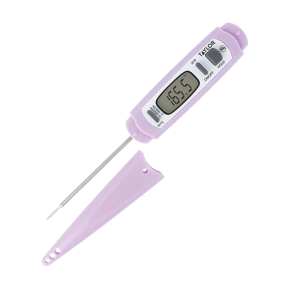 This Taylor thermometer is designed to prevent cross‐contamination and is ideal for allergen‐free products. It features a 1.5mm diameter tip that is FDA‐recommended with a 3‐3/16" probe. The large display shows internal temperatures of meats with a range of ‐40 to 450°F. This thermometer has an accuracy of +/− 2°F. You can get a readings in about 5 seconds or less for quick and precise temperature checks.