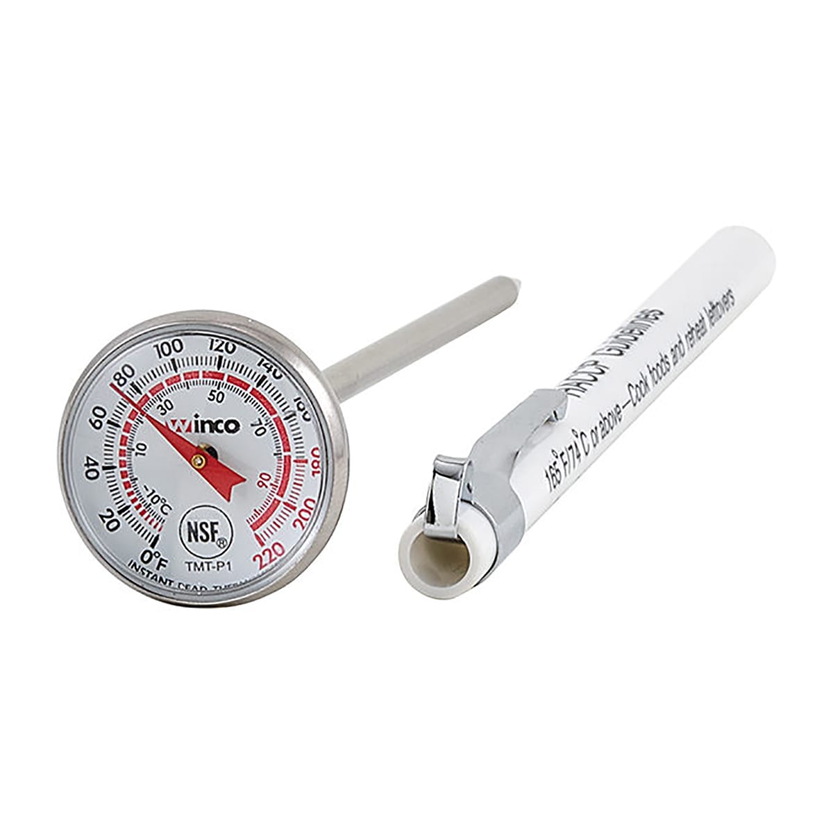 This pocket test thermometer from Winco® features a 1" diameter dial face with a 5" probe and has a temperature range of 0°F to 220°F.