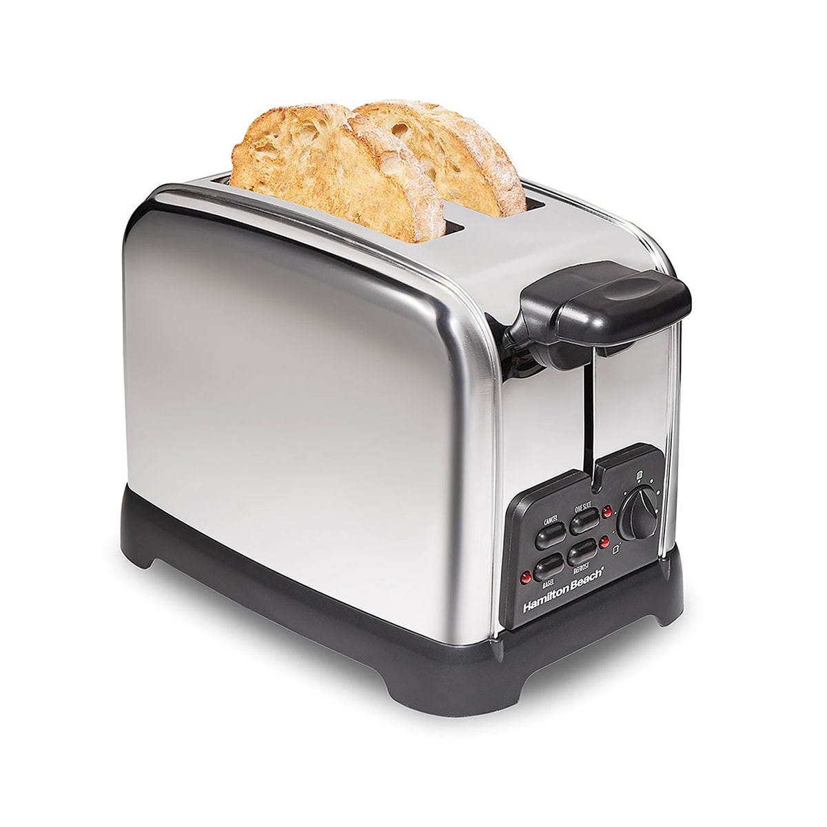 This Hamilton Beach® 2 Slice Brushed Stainless Steel Toaster has 2 extra-wide slots to easily toast thicker breads like bagels and Texas toast. You'll make perfect toast every time to enjoy during meals or for snacks. From bagels and lox for breakfast to open-faced roast beef sandwiches for dinner, you'll find lots of ways to get creative with toast using this versatile wide-slot toaster. Toast Boost lets you lift smaller breads higher so they're easier to retrieve from the toaster. No more struggling to get your toasted English muffins and gluten-free slices from the toaster. Tired of undercooked bagels? The bagel function toasts bagels for extended time so they're perfectly toasted every time. Cleanup is easy too. The 2 slice toaster has a slide-out crumb tray that catches crumbs to keep your countertop clean. For peace of mind, the toaster automatically shuts off at the end of the toasting cycle, even if toast gets jammed. Or stop the toast cycle any time by simply pressing the cancel button. Choose from 7 toast shades for lighter or darker toast. Stylish as well as functional, the brushed stainless steel finish will look great in your kitchen.