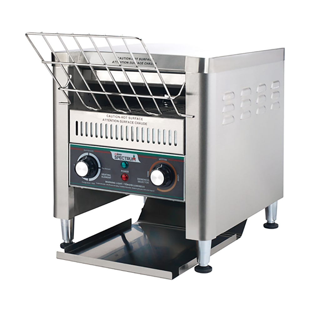 Spectrum conveyor toasters are perfectly designed for evenly toasting breads, bagels, and small pizzas. Great for busy kitchens, this toaster is easy to operate and the top and bottom heating elements can operate simultaneously or independently. The rounded, extra‐wide return ramp allows it to work for oversized bagels or Texas toast. This toaster includes an easy‐load rack, front return chute, and an optional rear product return.