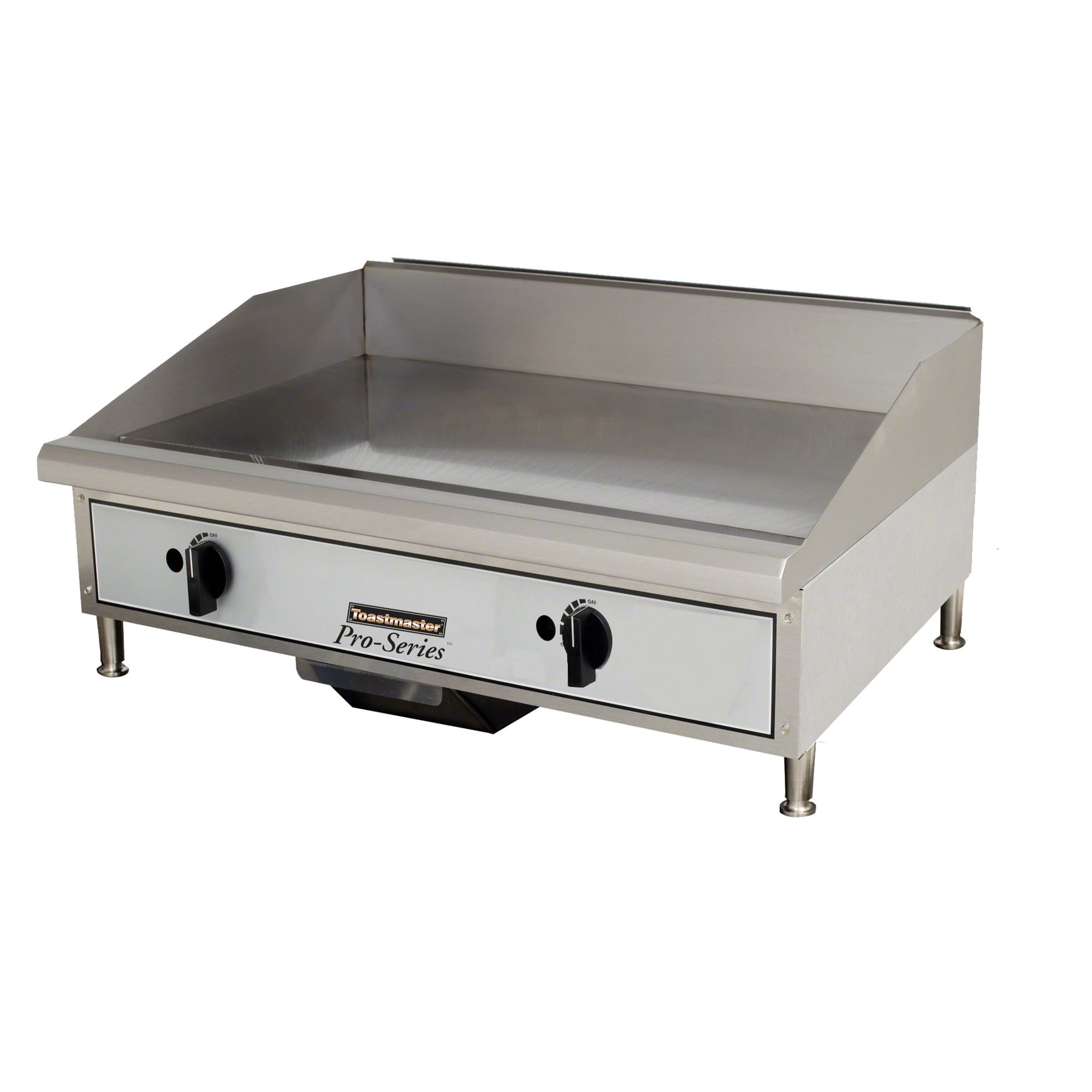 This Toastmaster™ Gas Griddle has a 24" width and is great for any food service operation. It has a manual control valve and ultra smooth 3/4" thick polished steel plate griddle. It includes a front grease trough and grease drawer for easy cleanup. It stands on 4" high die cast nickel‐plated legs.