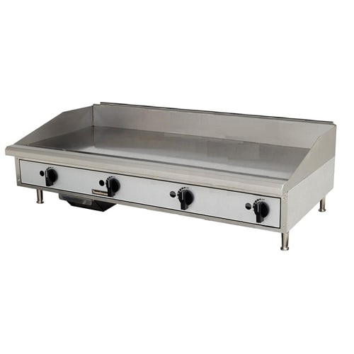 This Toastmaster® Gas Griddle has a 48" width and is great for any food service operation. It has a manual control valve and ultra smooth 3/4" thick polished steel plate griddle.