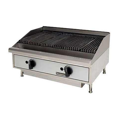 This Toastmaster™ Radiant Gas Charbroiler has a stainless steel front panel and reinforced aluminized steel side panels. It has 30,000 BTU burners every 12" of width, and comes in a 24" size. Its heavy‐duty cast iron grates are reversible, with a thin side for searing and a thick side for more delicate food items. It stands on 4" adjustable legs.