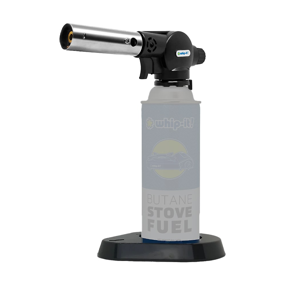 This Blow Torch is a lightweight, portable butane torch designed for precision culinary tasks. Featuring a one-touch piezoelectric ignition and adjustable jet flame, it reaches temperatures up to 2,500°F, making it ideal for caramelizing, browning, and searing. It attaches directly to Whip-It! butane fuel canisters (sold separately) and includes a detachable base stand.