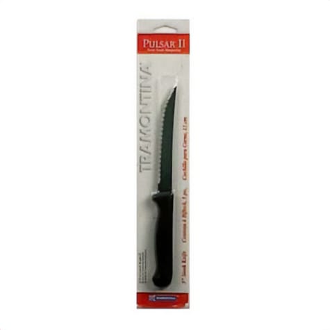 This Pulsar II steak knife from Tramontina sold by Darling features a 5" stainless steel blade with a black polypropylene handle. Perfect for any restaurant!