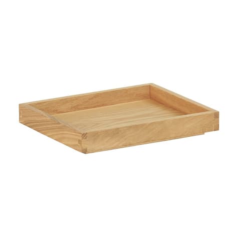 The Cal-Mil 23106-10121-21 is a 12" x 10" rectangular display tray made from handcrafted oak, featuring a 1.5" height. Its natural wood grain and minimalistic design make it perfect for showcasing individually packaged snacks, produce, or condiment jars in buffets, cafes, and catering operations.