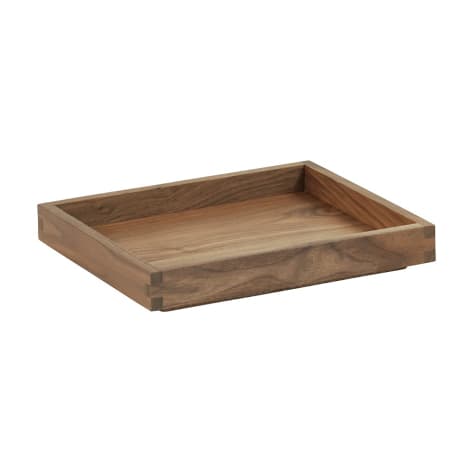 The Cal-Mil 23106-10121-21 is a 12" x 10" rectangular display tray with a walnut finish, featuring a 1.5" height. Its natural wood grain and minimalistic design make it perfect for showcasing individually packaged snacks, produce, or condiment jars in buffets, cafes, and catering operations.