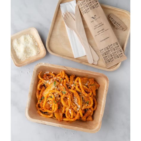 This palm base and lid is made using fallen palm leaves and is a beautiful addition to your take‐out containers. This container is microwave and oven safe and is stackable to save space.