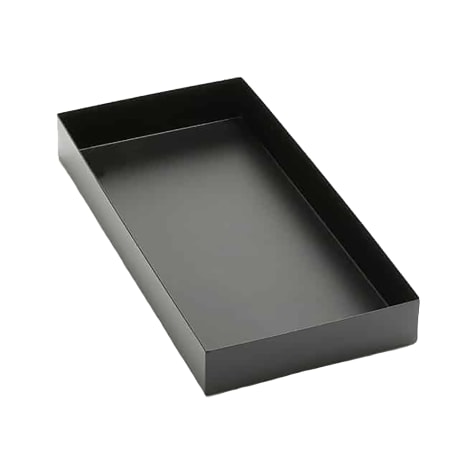 This rectangular market tray from American Metalcraft's Black Twilight collection measures 16-3/8 inches by 8-1/4 inches with a 2-inch height. Made from stainless steel with a striking black finish, it adds contemporary flair to any display. Perfect for showcasing meats, salads, or pastries, this tray is dishwasher-safe for easy maintenance.