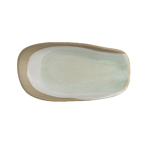 This 9" x 4.5" rectangular tray is part of the Forager Collection by Robert Gordon and is designed with a carefully applied reactive glaze that free-flows over each shape to create a unique finish. Featuring an unglazed bottom, this collection highlights the richness of raw materials through exposed stoneware and offers a handmade & organic appeal. From the creator himself, Robert "Andy" Gordon, he compares the signature tray design to "tree bark once used to gather things such as forage seeds, berries, and roots from the forest", hence its namesake, Forager. Unlike any other, these enduring & functional shapes are finished with a stamp of Andy's handwritten signature and will enhance any foodservice presentation.