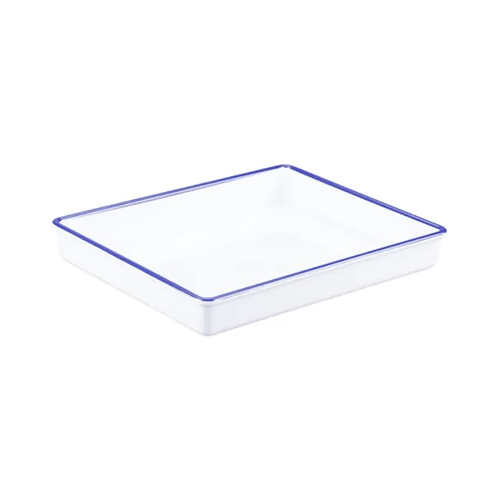 Serve salads, pastas, or fruit in these deep melamine enamelware trays from Cal‐Mil. Made of durable melamine, these trays are functional and easy to clean. Featuring a bright blue edge on the perimeter of the tray which will complement your food.