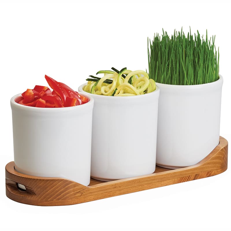 This Madera Cylinder Tray from Cal‐Mil helps keep your packets and condiments neat and tidy, all while having end cutouts for easy lifting and transport. This tray includes three, 32 ounce white jars to display a variety of items.