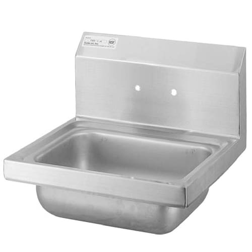 This Turbo Air wall‐mount sink has an 8" high splash and a 4" faucet. It has an all‐welded stainless steel construction with an inverted V‐edge rim.