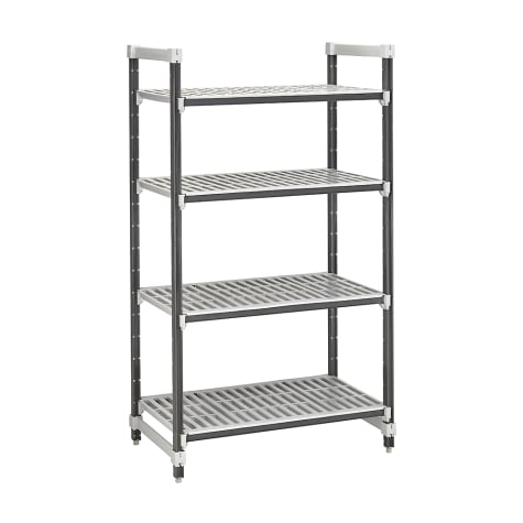 This Camshelving® Elements® Xtra Series Shelving Unit from Cambro® will help keep your busy kitchen organized! It is crafted from durable composite plastic that won't rust or corrode. Ideal for various storage needs, including dry storage, coolers, freezers, and dish rooms, Elements XTRA boasts a remarkable weight capacity of up to 2,400 lbs per unit (for units up to 60 inches). Its removable traverses allow for easy shelf height adjustments, while the solid shelf plates offer stability, spill prevention, and efficient cleaning. Whether in a commercial dishwasher or wiped down with a cloth, maintaining these shelves is a breeze!
