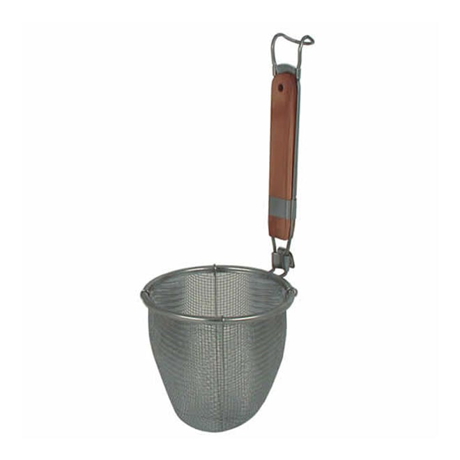 You can cook noodles in this strainer and then transfer right to the plate. This strainer has a wooden handle and a hook for hanging on a utensil rack.