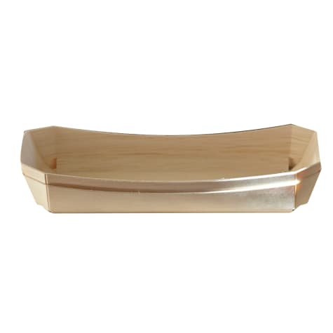 This 3" x 8" collapsible tray is made of compostable and biodegradable balsa wood with a rice paper finish. These trays are water and grease resistant.
