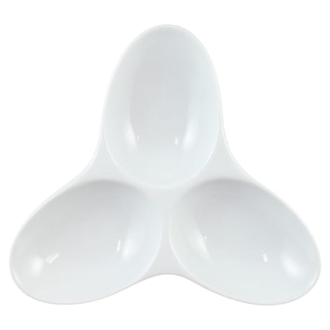 This tripod dish has 3 compartments for serving 3 different food items. Serve eggs, sauces, or dips.