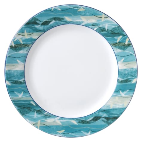 The cool, calm blues of the ocean are echoed on the Rubicon Palm Springs Oasis collection. Whether serving breakfast, lunch, or dinner, this creates a relaxing oasis. Because this china is stronger than other china, it will provide years of daily use. This plate is 11‐1/8" in diameter and is both dishwasher and microwave safe.