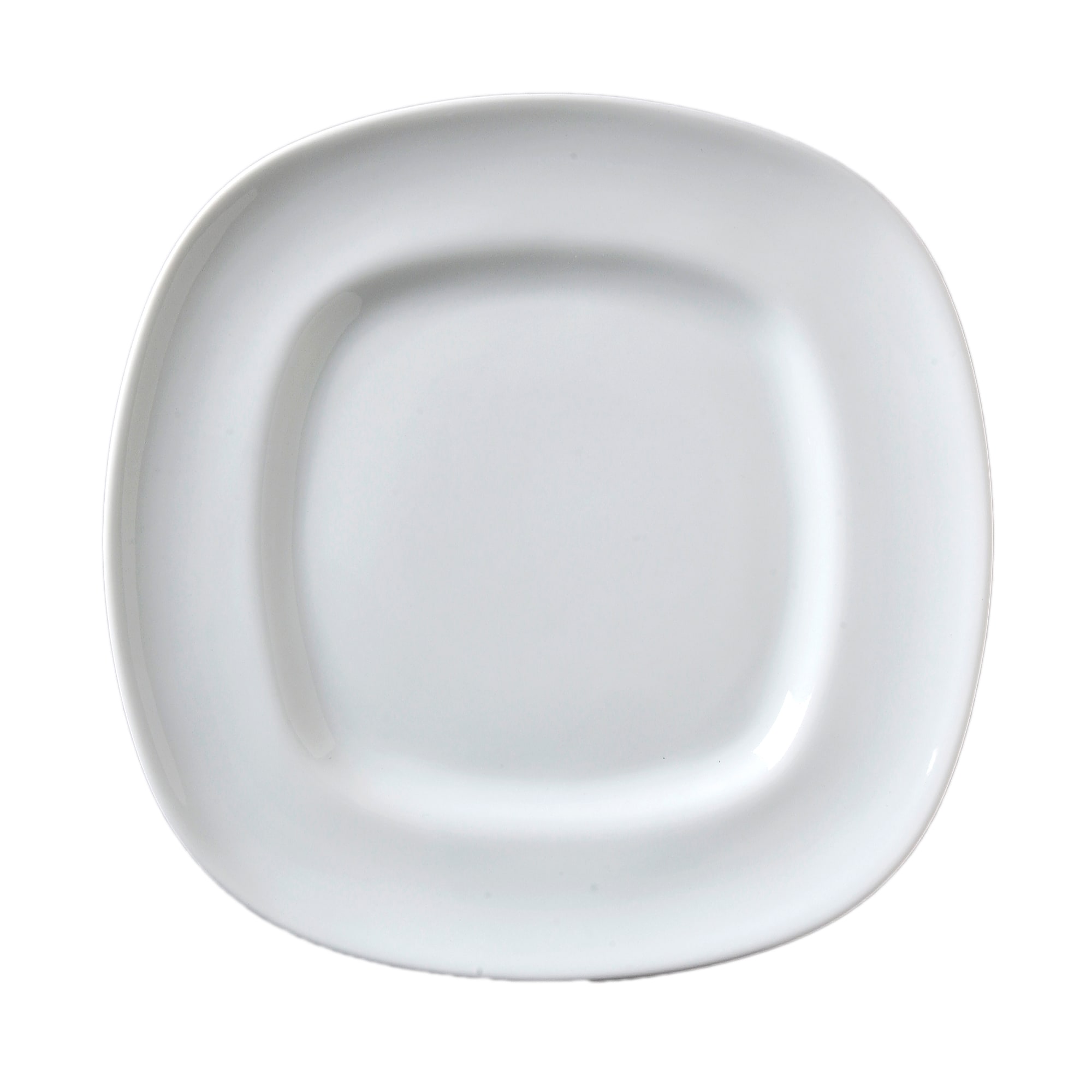 The unique design of this square plate provides a creative way to serve desserts or appetizers. The Signature collection's geometric shapes create a contemporary look for the dining experience. Made from bright white porcelain, this china looks great with any pattern or color.