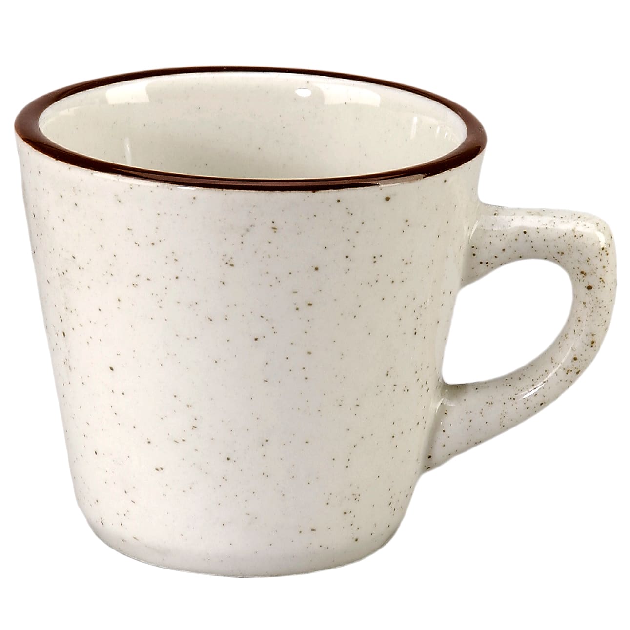 This 11 ounce coffee cup with brown bands and speckles is a great solution for serving coffee or tea. This cup has a classic look and is durable. This cup is microwave and dishwasher safe for easy reheating and easy cleaning.
