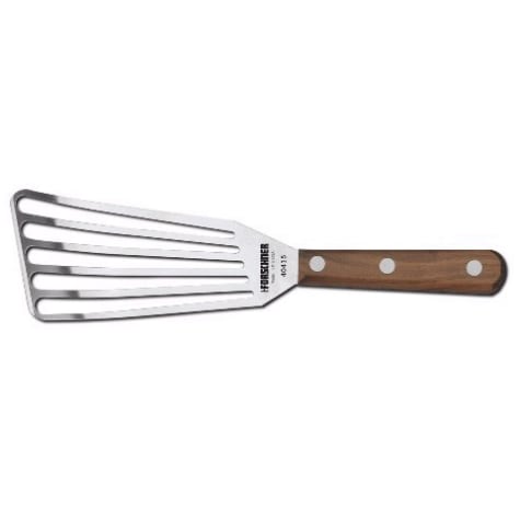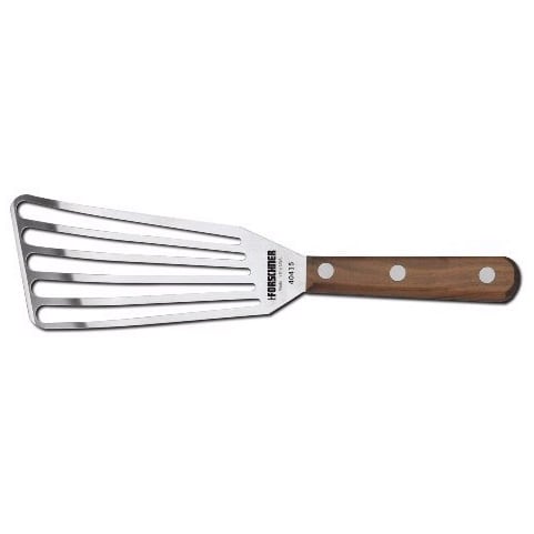 This Victorinox Chef's Turner has a slotted design and is ideal for use with fish. It has a 3" x 6" blade and is finished with a natural wood grain handle. Hand washing recommended.