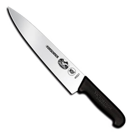 This Victorinox Fibrox® Pro Chef's Knife comes in a 10" size and is an essential knife for any kitchen. It can be used for dicing, mincing, chopping, slicing, and more. Its TPE handle is ergonomic and comes in a black color. This knife is dishwasher safe and can be sterilized. It is designed for long service life.