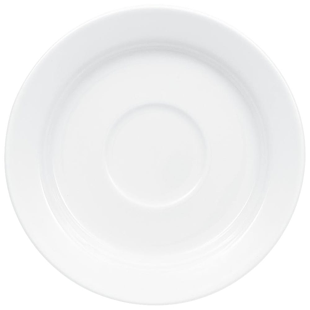 This white porcelain saucer fits the Corpo 7.5 ounce coffee cups (Item 617404, sold separately).