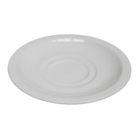 This white porcelain saucer fits the Easy White coffee cups (Items 455437, 440635, 510602, and 440637, sold separately).