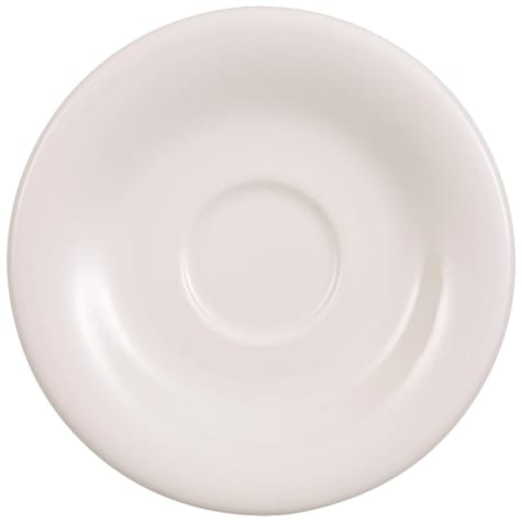 This white porcelain saucer fits the Dune 6 ounce coffee cups (Items 528308 and 528309, sold separately).