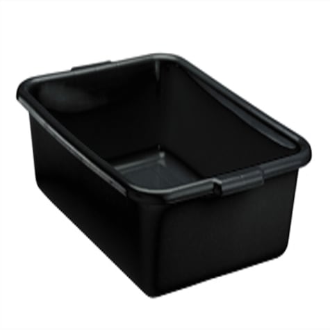This Traex® Black Bus Box can be used to hold dirty dishes and to clean off an entire table in one trip. The Bus Box has Tapered Side Walls and Stacking lugs that permit easy separation.