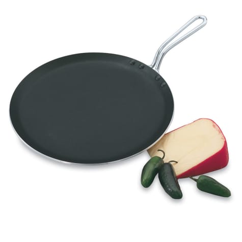 Whip up a stack of pancakes or some perfectly grilled cheeses with this Vollrath SteelCoatx3 12 inch Griddle. The non-stick coating allows you to use less fats and oils and the riveted wire handle is perfect for hanging.