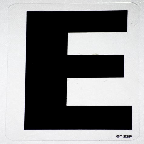 This Letter E" is for use on marquees or reader boards. It is a 6" solid black letter on a 7" clear acrylic panel. The letter is silk screened to the panel