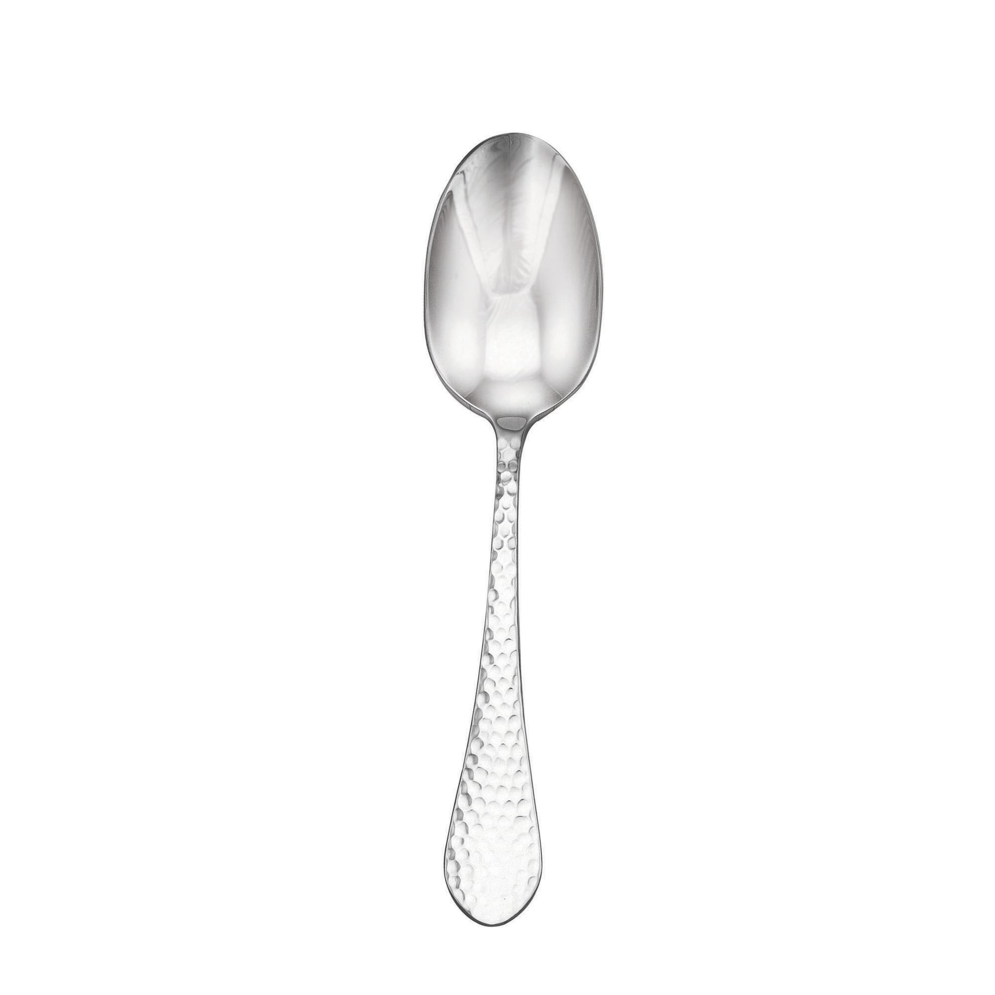 This Walco IronStone™ dessert spoon is made of 18/10 stainless steel. The handle has a classic 17th century hammered design. This design hides fingerprints and reflects light to make it sparkle. This flatware is designed for use with magnetic retrieval systems to protect your investment. IronStone™ is part of The Hallmark Collection 2000™ by Walco.