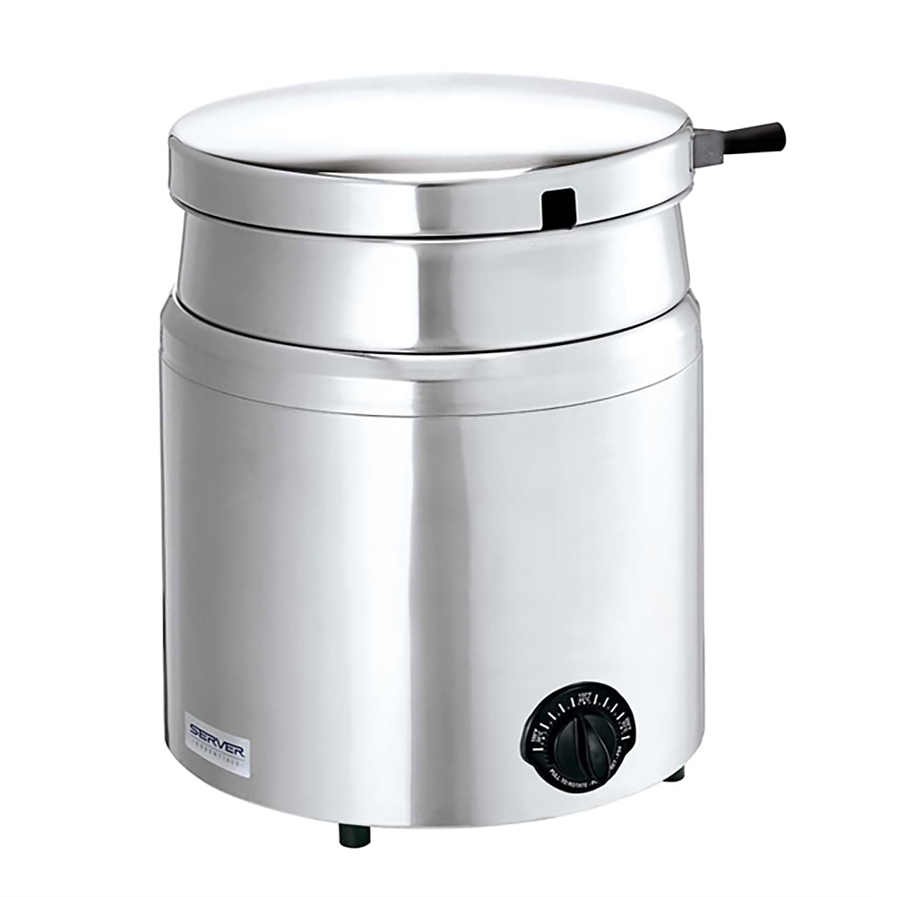 This stainless steel food server from Server Products features an 11-quart capacity, and keeps soups, chilis, and other hot foods at the perfect serving temperature. The hinged lid stays upright during ladling, collecting moisture and returning it to the food, ensuring freshness and convenience.