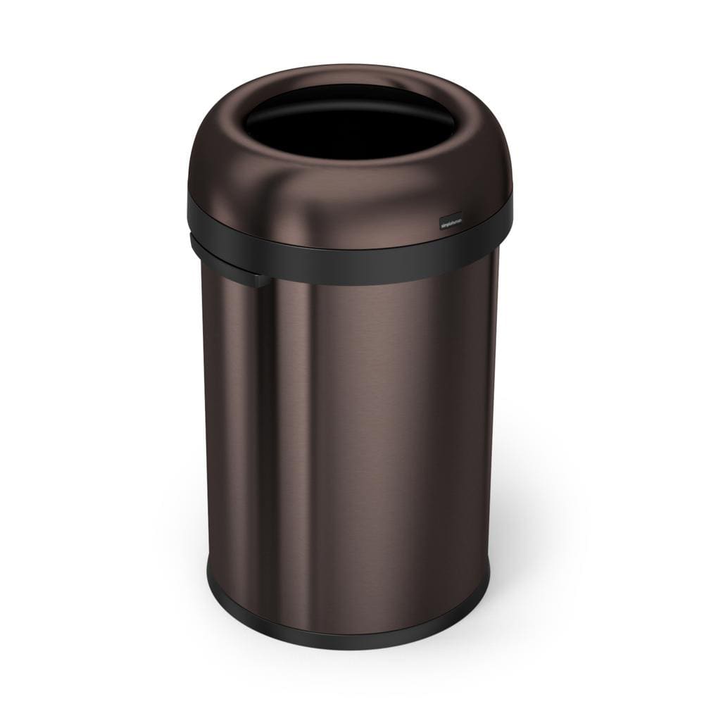 This open top waste can from simplehuman features a dark bronze color and the heavy-gauge steel construction makes this can dent-resistant and sturdy. This waste can has a 12" opening which makes it easy to scrape food off trays or toss in large items. Great for high-traffic commercial spaces!