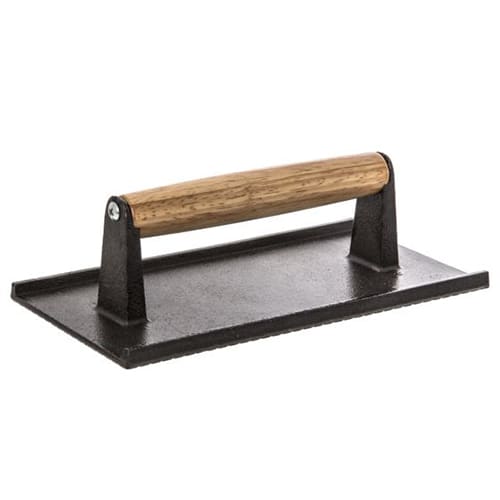This 8.25" x 4.75" steak weight from Browne Foodservice features a ribbed flat bottom with a wooden handle and keeps edges of steaks from curling during cooking.