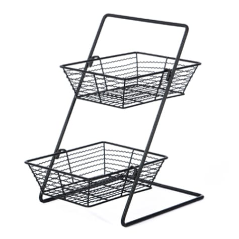 This Willow Specialties Wire Display Stand is perfect for markets or grocery stores. Display fresh produce or baked good in this 2 tier stand. It has a zig zag pattern and is black in color. The stand is 16" tall.