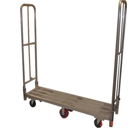This WinHolt U‐Boat cart has a narrow design so it is easy to navigate tight spaces. The two 6" stationary center load wheels and four 5" polyurethane swivel end casters makes maneuvering easy. It holds up to 1500 pounds.