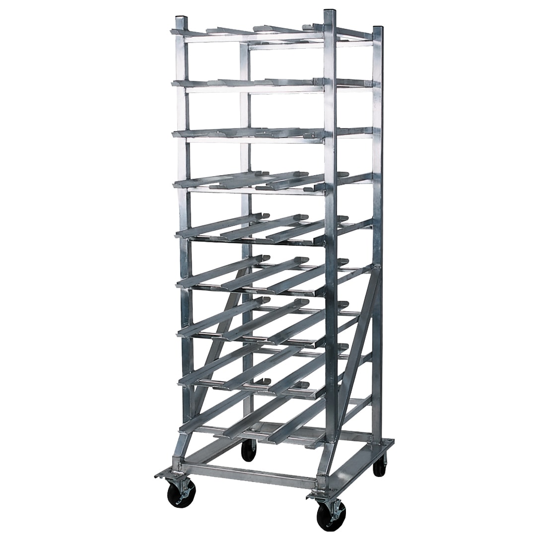 Organizes stock and maximizes available space. Self-feeding feature keeps stock rotated Vertical uprights and cross braces are constructed of 1-1/2" aluminum tubing.