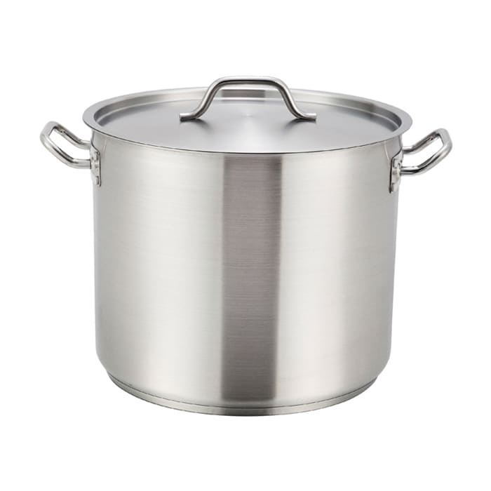 This Winco® Stock Pot has a generous 40 Qt. capacity and features stainless steel construction. It comes with a cover for faster cooking and less mess. This stock pot is great for making soups, sauces, and more.
