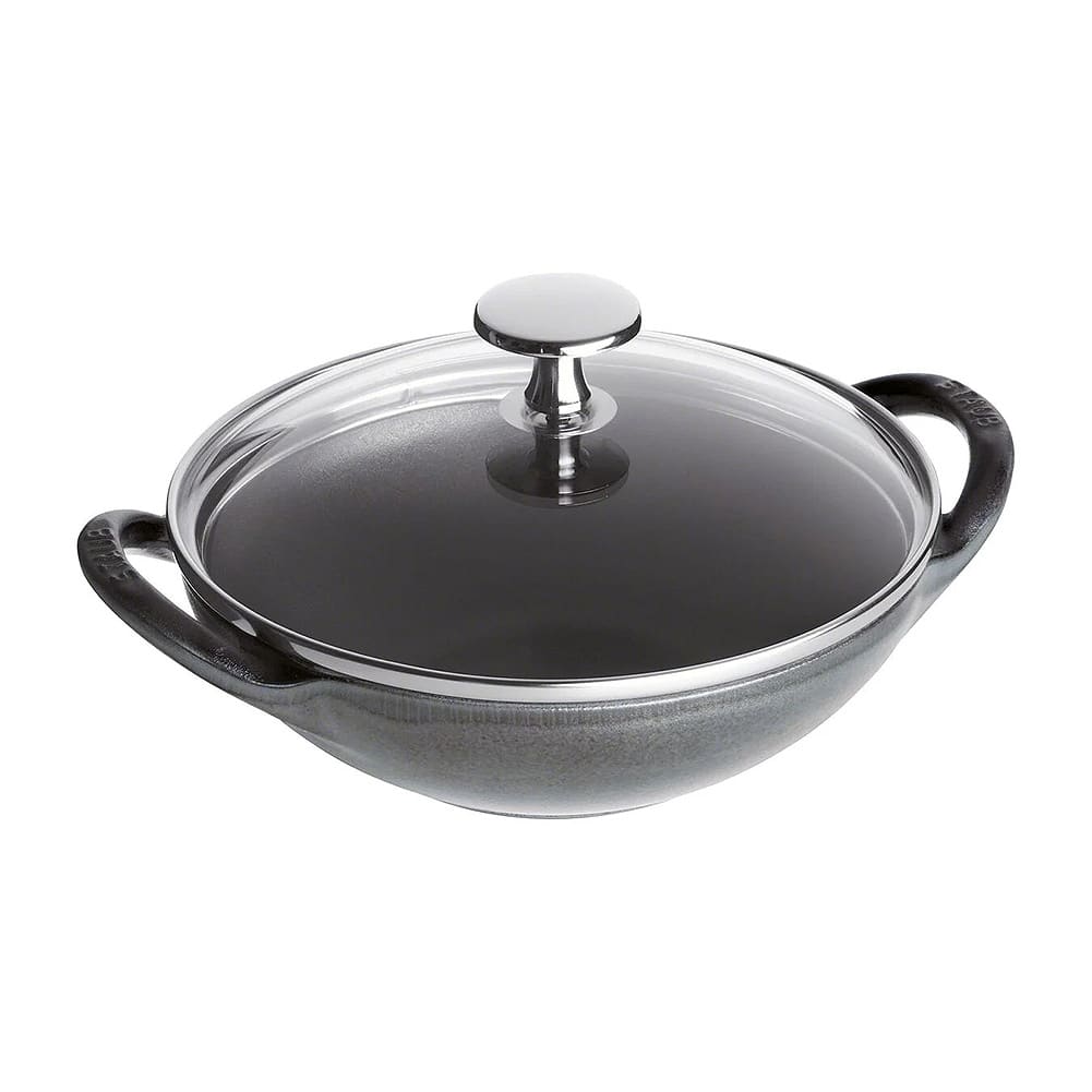 This Staub Baby Wok features black matte enamel inside and cooking surface that creates a culinary advantage for better browning, braising, and roasting. The gray enamel outside adds flare to your kitchen and table. Safe for use on all types of heat sources, including gas, electric, and induction, and oven safe up to 500°F.