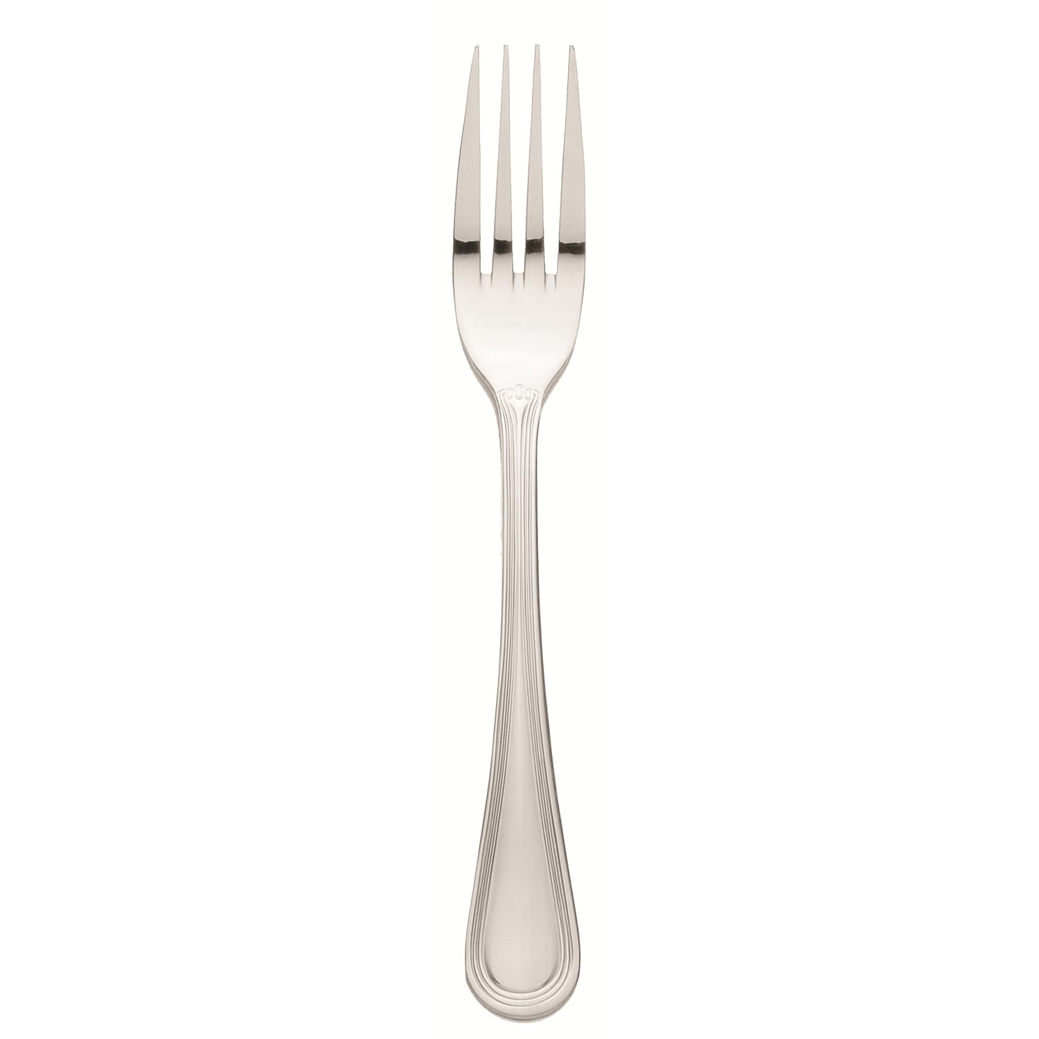 This World® Tableware Medium Weight Geneva dinner fork is ideal for serving alongside main courses and larger food portions.