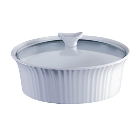 Streamline your kitchen-to-table tasks with this CorningWare 2.5 quart round stoneware casserole. Its fluted sides extend up and out to create space to support the inset glass lid. Works in microwave, oven, fridge, freezer, and goes in the dishwasher when you're done.
