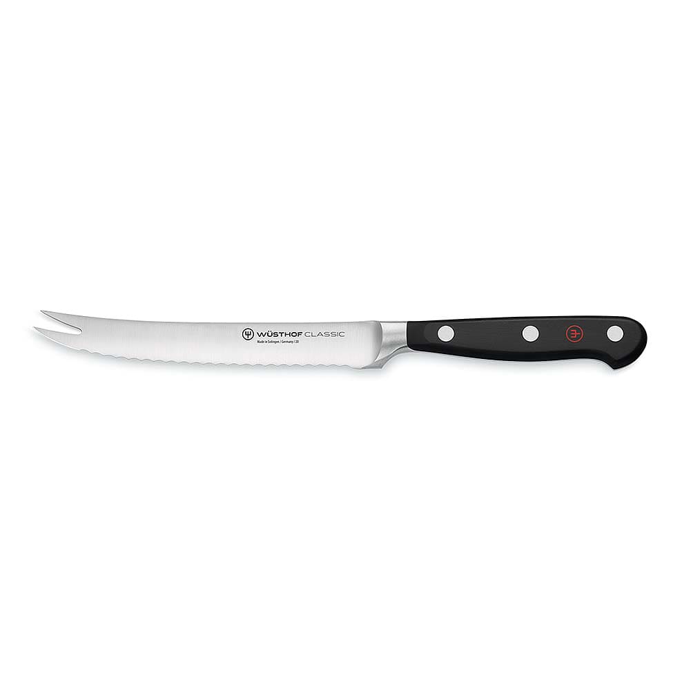 The serrated edge on this Wusthof Classic 5" tomato knife can make perfect, thin slices from even the softest tomato without crushing it. This edge is great for cutting through a tomato's skin as well as other vegetables.