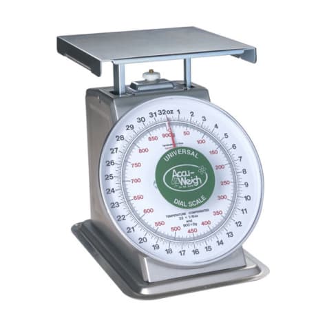 This stainless steel mechanical dial scale has an 8" dial which is tilted 30° for easy reading. It is very durable and is perfect for use in professional kitchens. This scale has a weight capacity of 25 pounds - in 2 ounce increments.